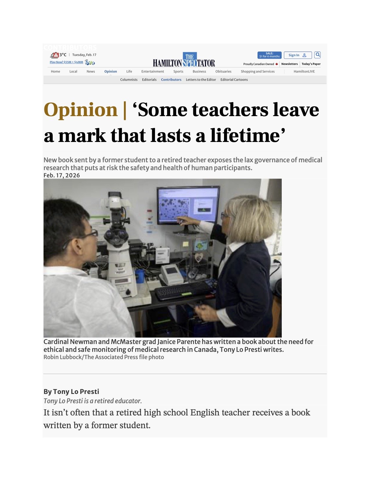 This opinion piece by Tony Lo Presti was published in The Hamilton Spectator (February 17, 2026). Shared here for accessibility in case readers encounter a newspaper paywall.